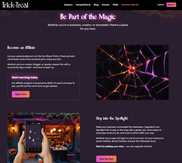 Integration with a referral layer (e.g., Viral Loops) allows users to earn tangible rewards for bringing friends. For larger-scale acquisition, the platform supports influencer and affiliate programs (via Awin) with a dedicated Partnerships page and streamlined onboarding. Together, these channels reduce CAC, amplify word-of-mouth, and create compounding growth beyond paid media alone.